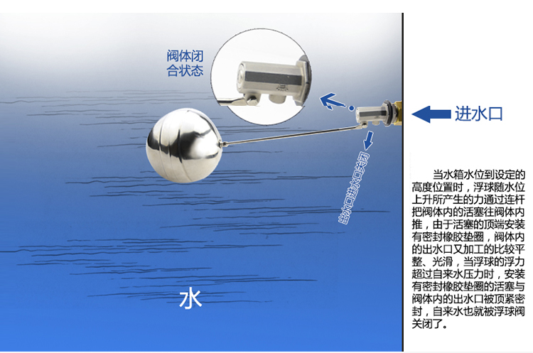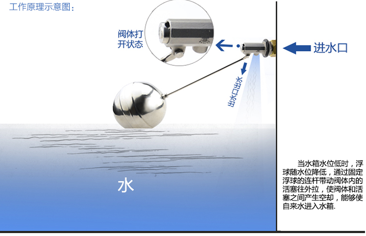 當(dāng)水塔內(nèi)水面下降時(shí),浮球下落,利用水管內(nèi)水的壓力,將閥體里的密封硅膠柱塞打開,閥體開啟供水,當(dāng)水塔水位上升時(shí),浮球上浮,連桿帶動(dòng)柱塞,硅膠體密封進(jìn)水孔,閥體停止供水.