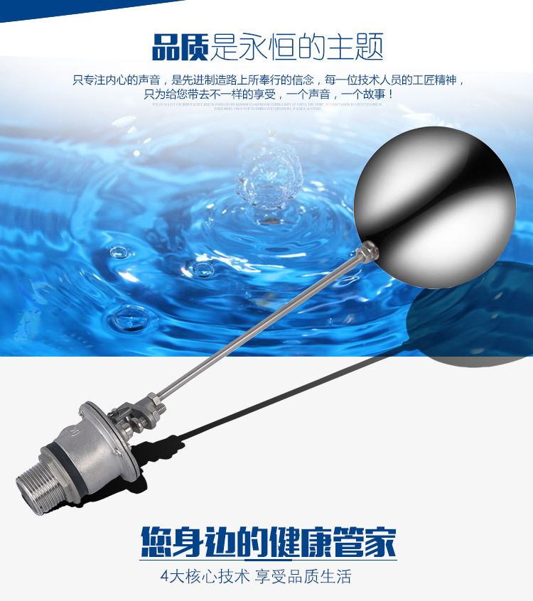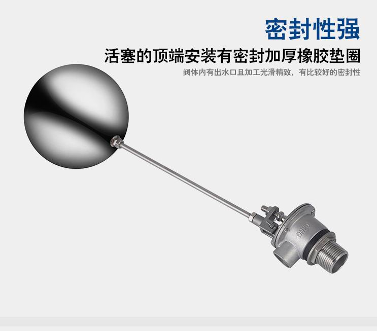 當水塔內(nèi)水面下降時,浮球下落,利用水管內(nèi)水的壓力,將閥體里的密封硅膠柱塞打開,閥體開啟供水,當水塔水位上升時,浮球上浮,連桿帶動柱塞,硅膠體密封進水孔,閥體停止供水.