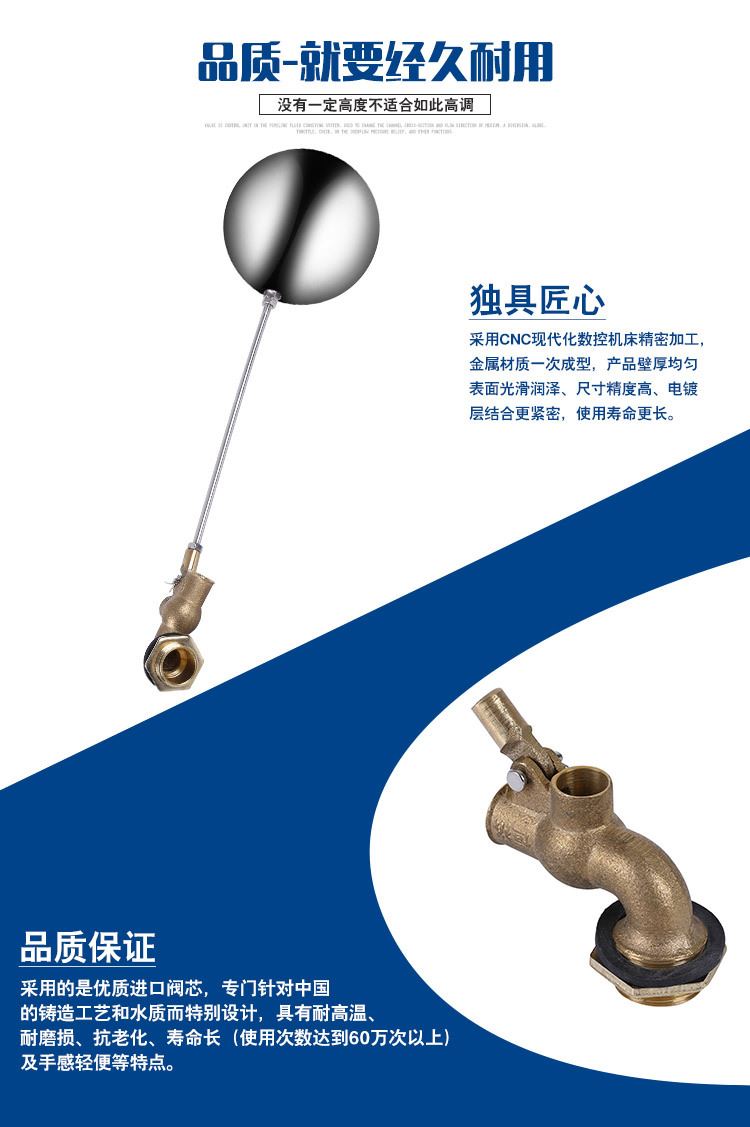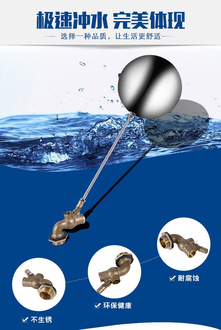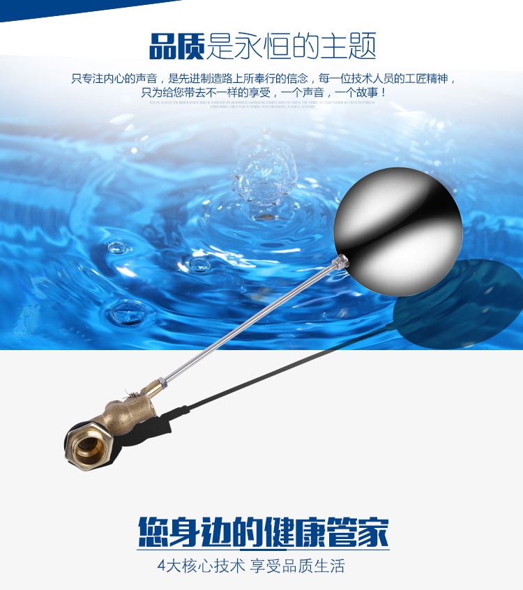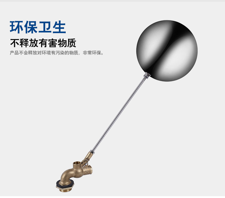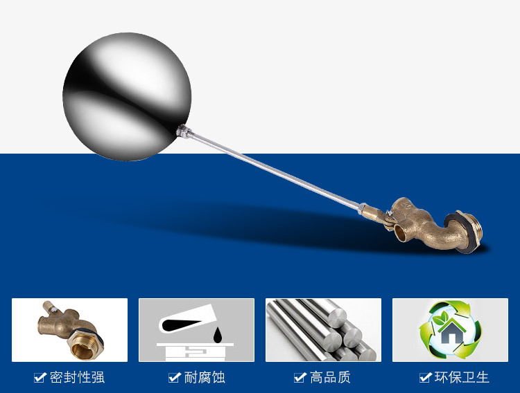 當水塔內水面下降時,浮球下落,利用水管內水的壓力,將閥體里的密封硅膠柱塞打開,閥體開啟供水,當水塔水位上升時,浮球上浮,連桿帶動柱塞,硅膠體密封進水孔,閥體停止供水.